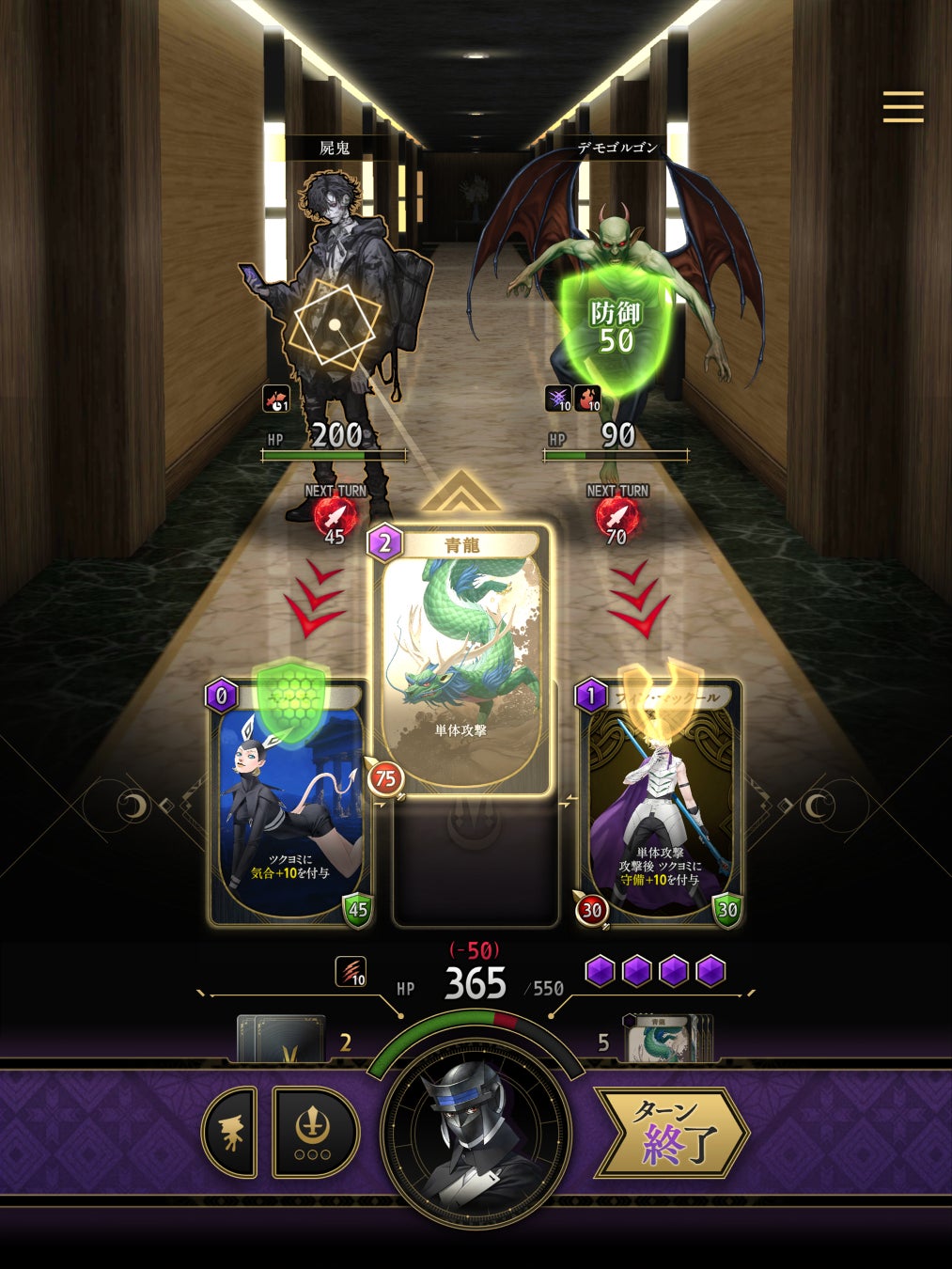 山札からランダムに配布されるカード「神魔札」を、戦況に応じて使い分けましょう。