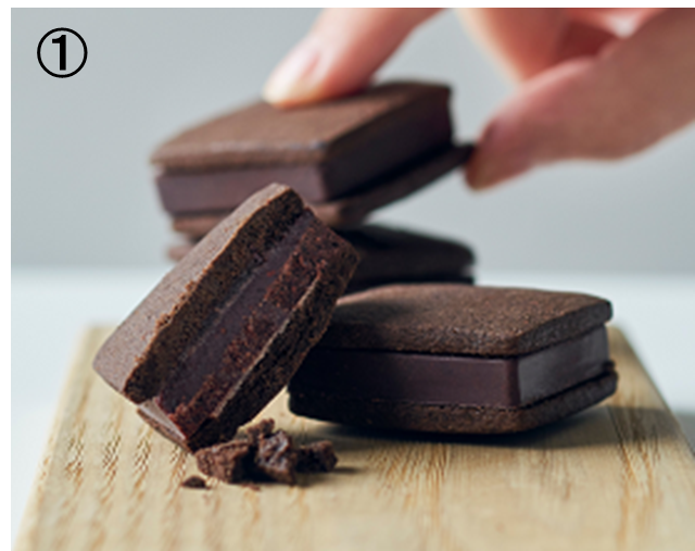 ①空気を含む特別な方法によって作られたふわっとほどける新食感チョコレート。厚みのあるチョコレートとサクサクのラングドシャが重なった、満足感のあるチョコレートサンド。
