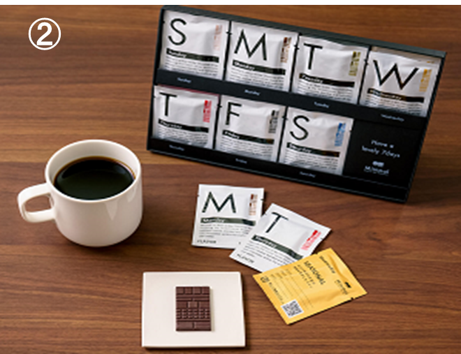 ②カカオが違う7種類のチョコレートが2枚ずつ入ったアソートセットです。アドベントカレンダーのように曜日ごとにセレクトしたチョコレートを毎日1枚ずつ楽しむことができます。