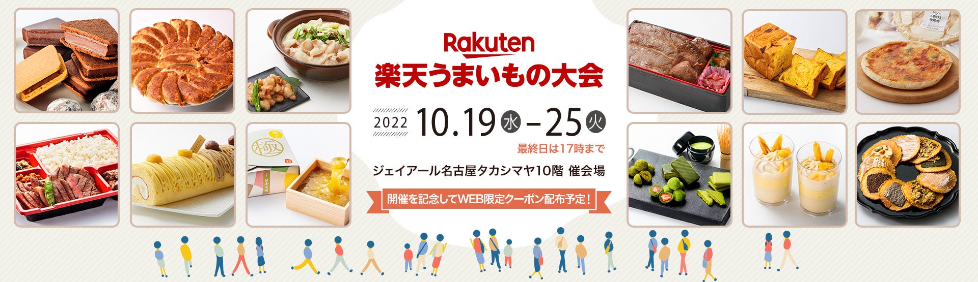 楽天グループ株式会社(以下「楽天」)は、運営するインターネット・ショッピングモール「楽天市場」で人気のグルメを集めた「楽天うまいもの大会」を10月19日(水)から10月25日(火)までの7日間、株式会社ジェイアール東海髙島屋が運営する百貨店「ジェイアール名古屋タカシマヤ」で開催します。「楽天うまいもの大会」は2010年より実施しており、「ジェイアール名古屋タカシマヤ」における「楽天うまいもの大会」の開催は、9回目で、2019年10月に開催して以来3年ぶりとなります。