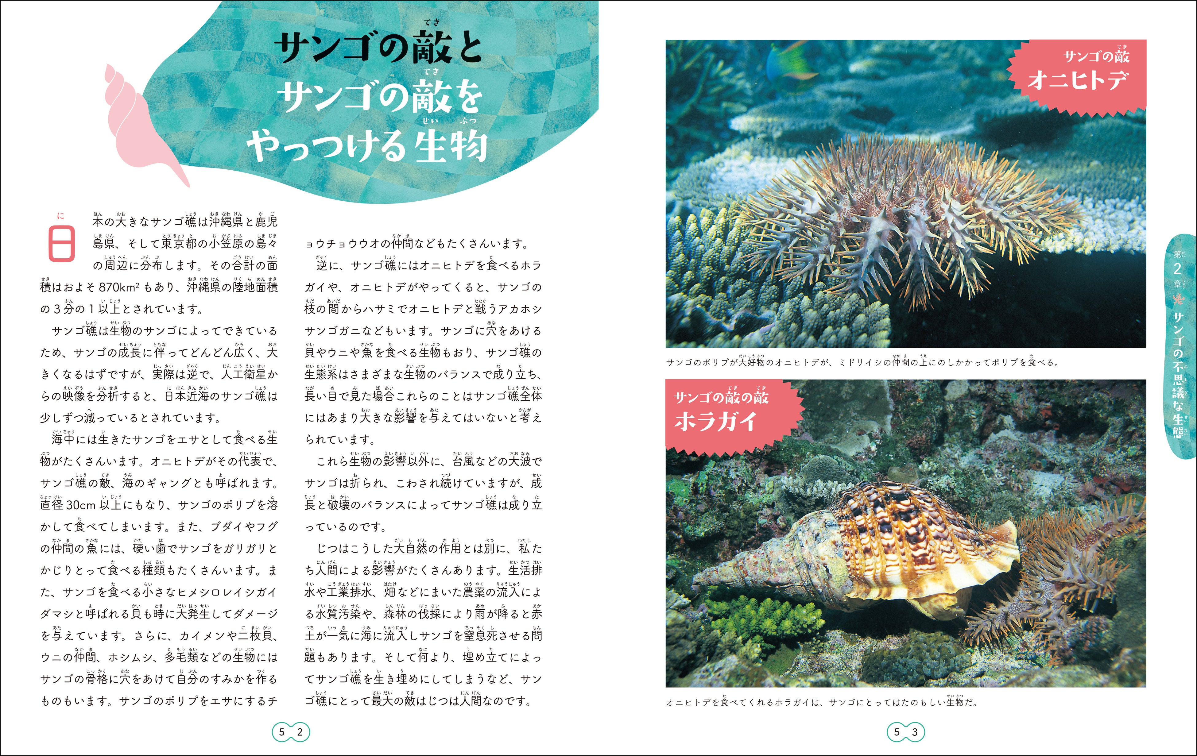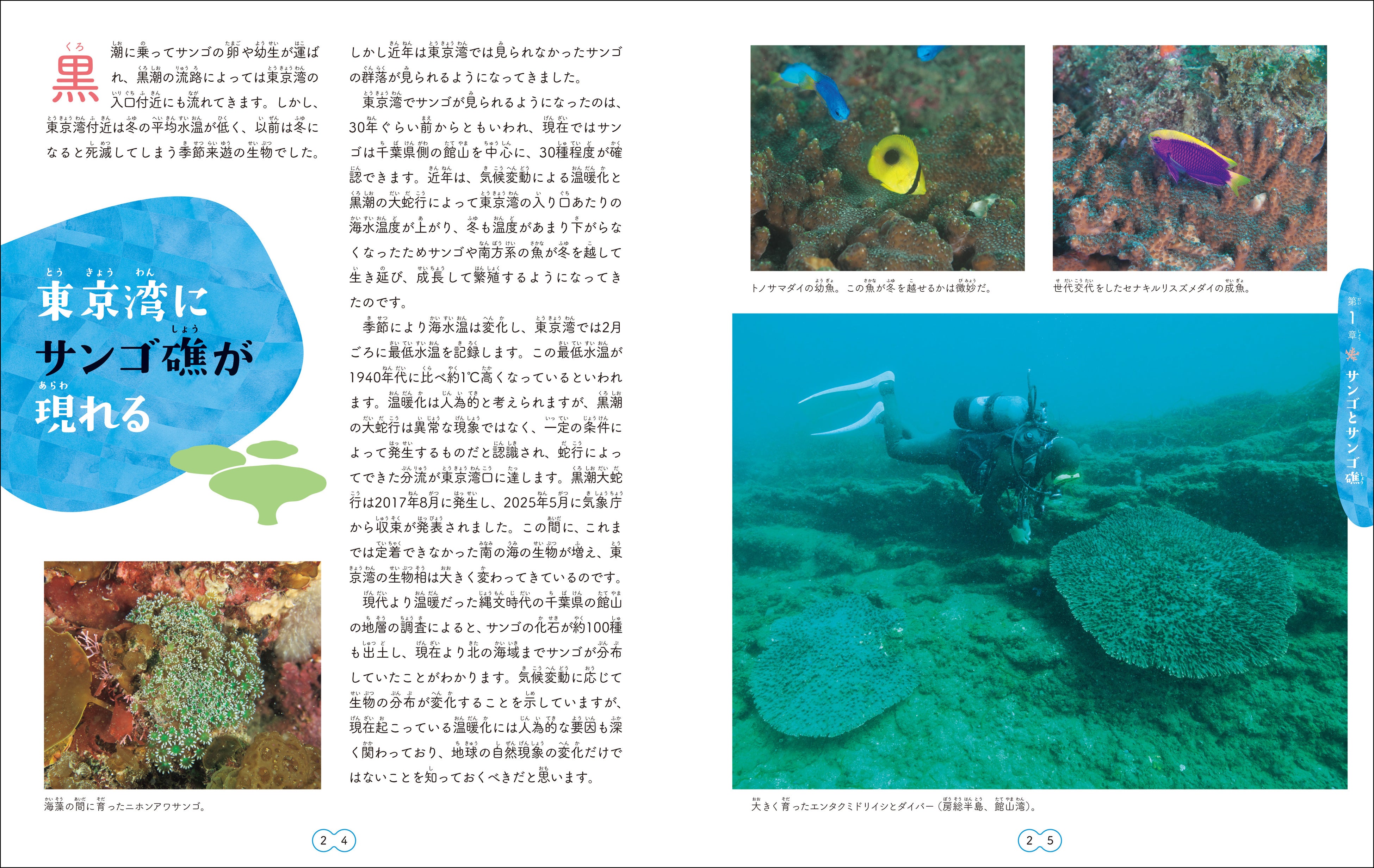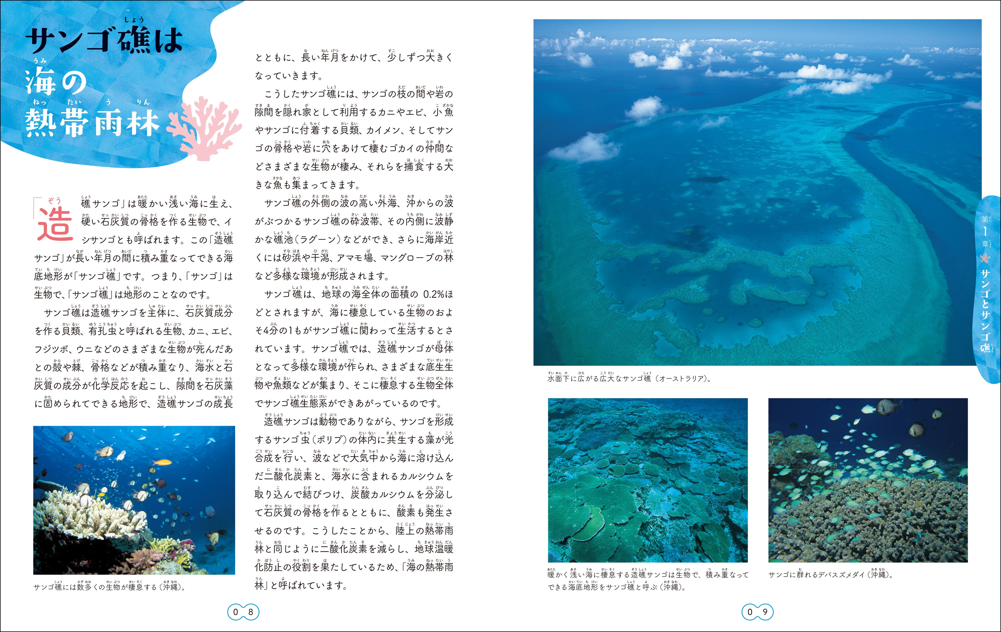 それに加えて、サンゴの生態や、サンゴ礁の成り立ち、気候変動による影響にも触れています。