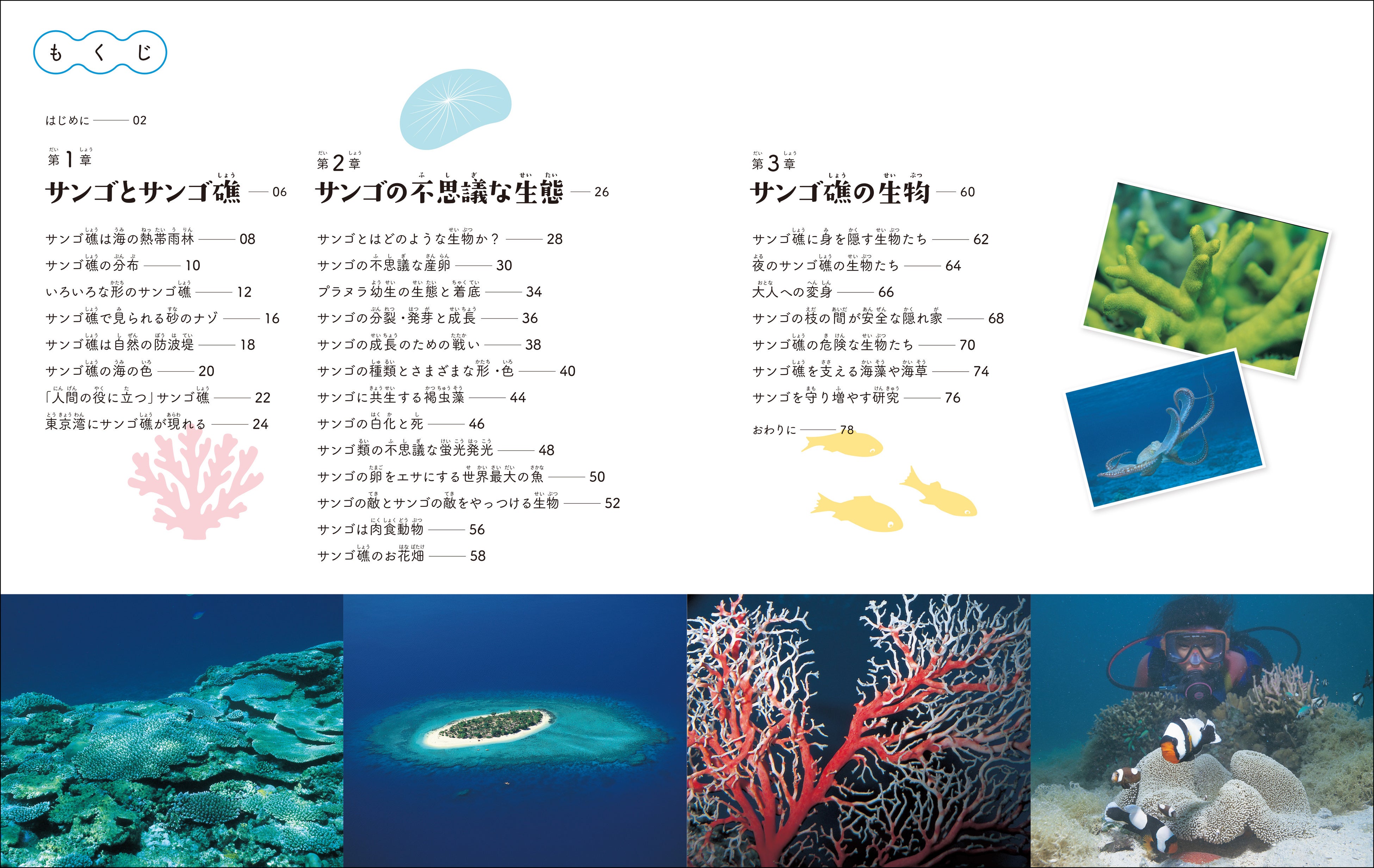 美しいサンゴ礁や、そこに棲む生き物たちの姿をたくさんの写真で楽しみながら、海や海の生物について、また地球環境について考えるきっかけになる1冊です。