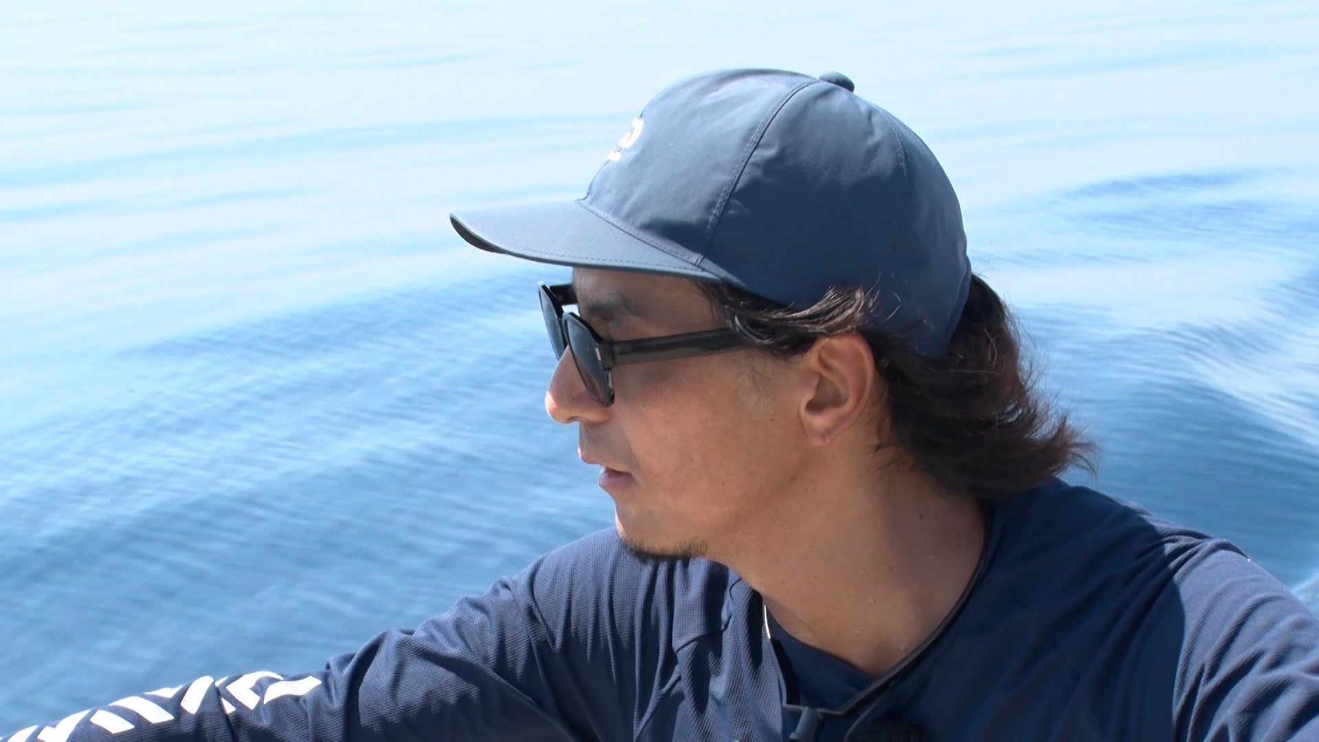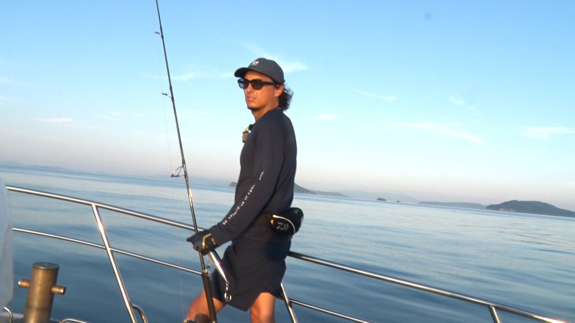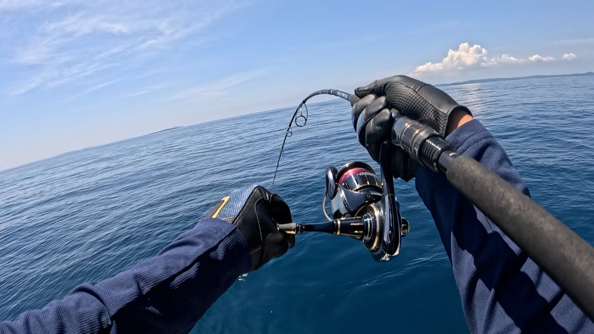 壱岐島の近くでジグを落とす。この夏の時期は、水温が高いためなかなか魚たちは口を使ってくれない。その中で末永は、自分が決めた、ジグ、ロッド、リールの組み合わせでこの日、魚に合う組み合わせを探る。