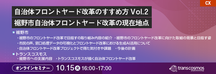【トランスコスモスオンラインセミナー】自治体フロントヤード改革のすすめ方 Vol.2~裾野市自治体フロントヤード改革の現在地点~を10/15(火)に開催