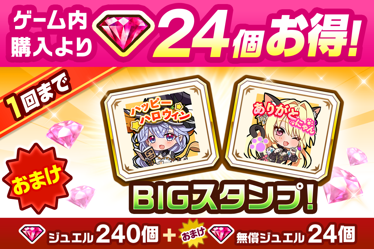 イベントの開催を記念して「新イベントキャラ保証」がついたお得な「プレミアムジュエルパック」や通常サイズより大きいスタンプがついた「BIGスタンプ付きジュエルパック」なども販売しております。『白猫』公式ストアではゲーム内よりもジュエルをお得に購入できますので、ぜひご利用ください。