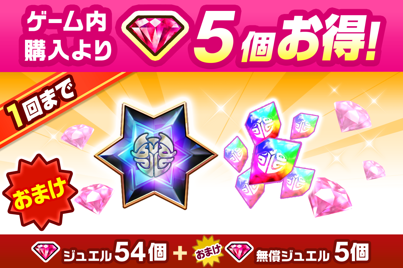 内容物:「ジュエル」675個、「無償ジュエル」65個、「新イベントキャラ保証」など
