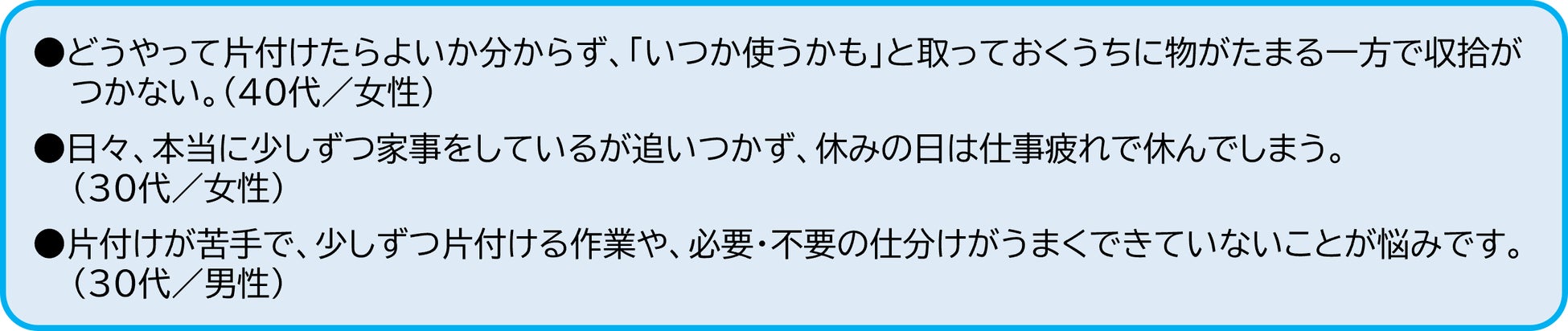 ●家が片付かない理由は、「面倒」「物が多い」「片付けが苦手」「時間がない」など