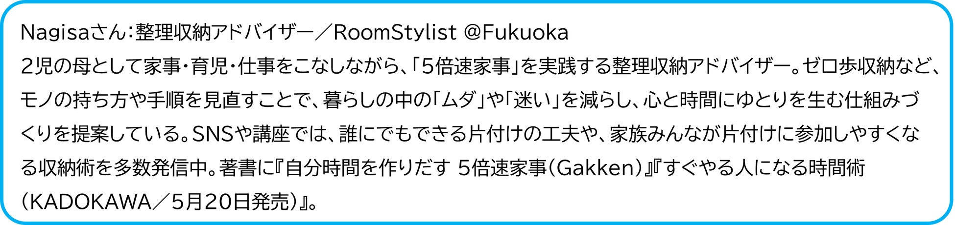 ▶My Kaoくらしラボ 「忙しい毎日でも続く片付けのヒント Nagisaさんの「5倍速家事」に学ぶ暮らしの整え方」 (2026年4月掲載)