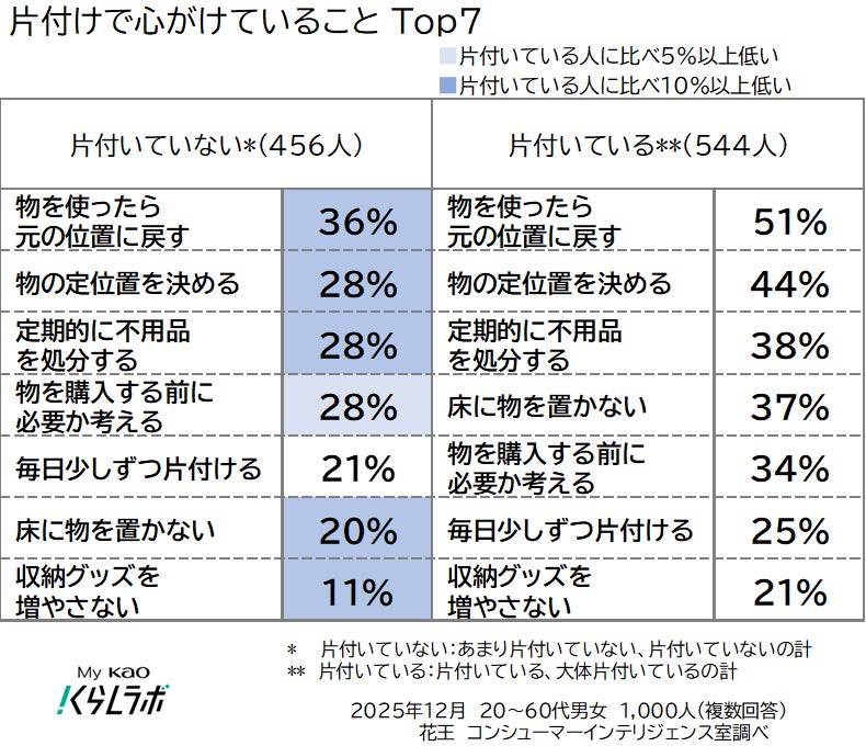 片付けで心がけていることを聞くと、上位に挙がる項目には片付いている人もそうでない人も大きな差はありません。一方で『片付いていない』人は、『片付いている』人に比べて、「使ったら元の位置に戻す」「定位置を決める」「定期的に不用品を処分」などを意識する割合が10%以上低いという結果でした。さらに、「物を購入する前に必要か考える」「床に物を置かない」「収納グッズを増やさない」などの意識も低いことが分かりました。