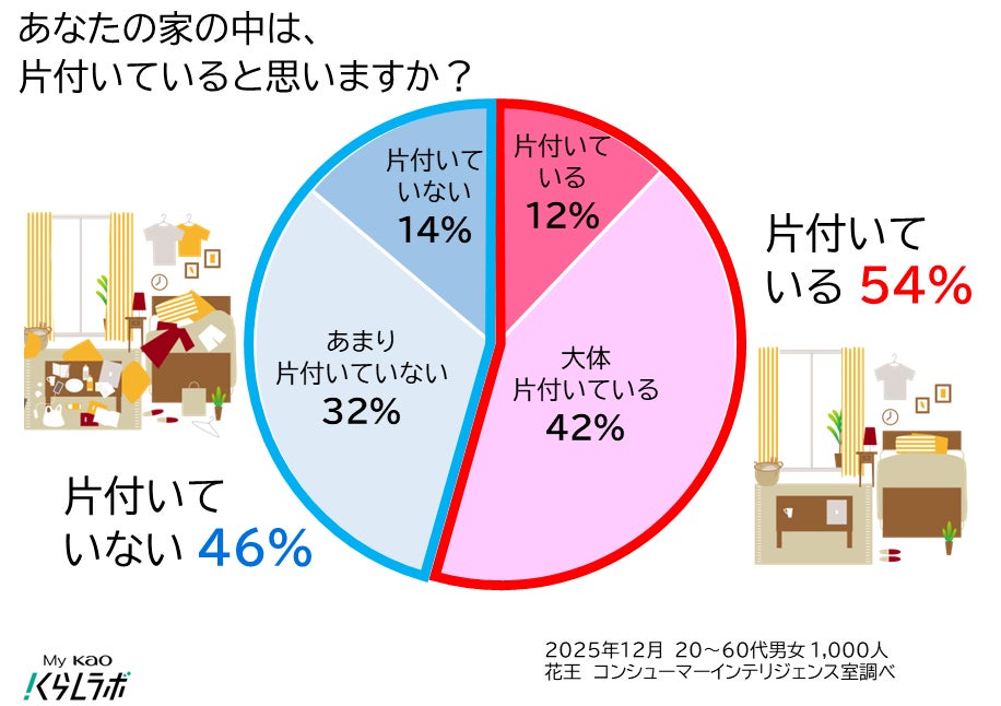花王の調査では、家の中が『片付いている』と感じている人は54%(片付いている/大体片付いているの計)、『片付いていない』人は46%(片付いていない/あまり片付いていないの計)と、ほぼ半数ずつという結果でした。『片付いていない』と回答した人が片付いていないと感じる場所は、「リビング」58%、「クローゼット・収納」40%が上位で、家族みんなが毎日使う場所ほど、自然と物が集まりやすく「片付けても、すぐ散らかってしまう」と感じる人が多いようです。