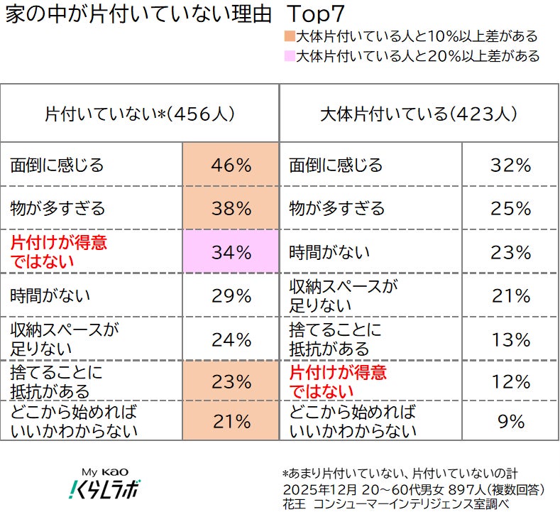 花王株式会社では、暮らしに関わる様々な調査を行っています。家の中の片付けに困ったり悩んだりしている人は少なくありません。定量調査や読者アンケートから見えた片付けの実態と、整理収納アドバイザーのNagisaさん(「5倍速家事」提唱者)への取材を基にした片付けの考え方をまとめた記事を「My Kaoくらしラボ」(※1)にて2026年4月7日に公開します。