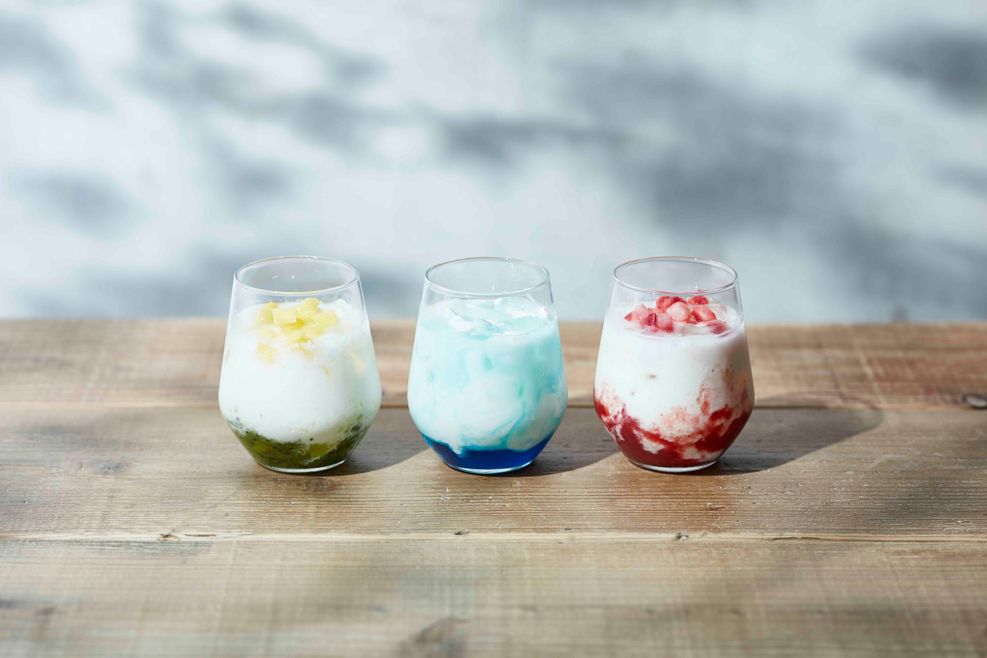 砕いたラムネをトッピングしたラムネヨーグルト、いちごの果肉が贅沢なストロベリーヨーグルト、パインの果肉とキウイが夏の気分を盛り上げるキウイパインヨーグルトの3フレーバーをご用意しています。