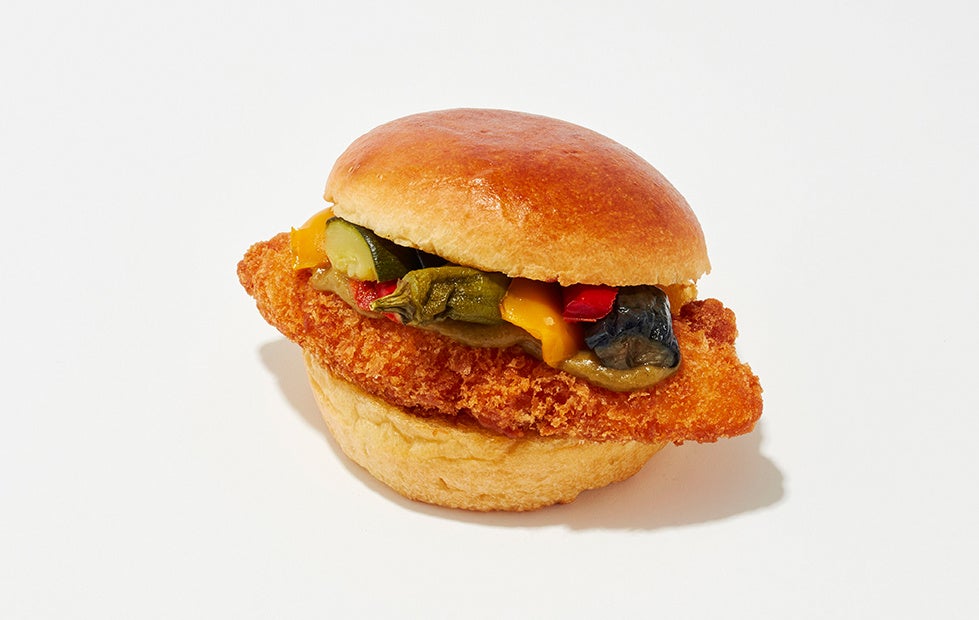 ココナッツミルクでまろやかに仕上げたタイ風グリーンカレーが食欲そそる!夏野菜入りフィッシュフライバーガー。