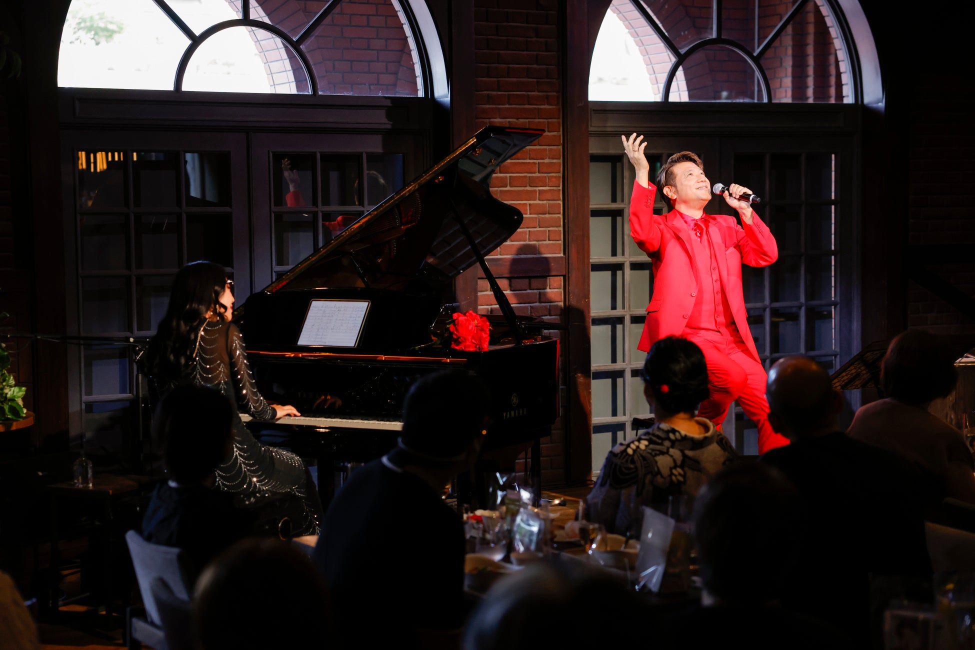 続いては、音楽パフォーマンスのセクションへ。8月29日に東京オペラシティ コンサートホールの公演を成功させたばかりの、ピアニスト・五条院凌がゲストとしてお祝いに駆けつけた。ショパンの「幻想即興曲」、ドビュッシーの「月の光」を奏でて優雅でファビラスな世界を創出。大きな拍手が起こる中、「今日、お別所さまには音のおプレゼントがございます」と告げると、別所に向けてオリジナル曲「Rose Waltz」を演奏した。会場に飾られた100本のバラにも負けない、艶やかで気高い音が花開いていた。