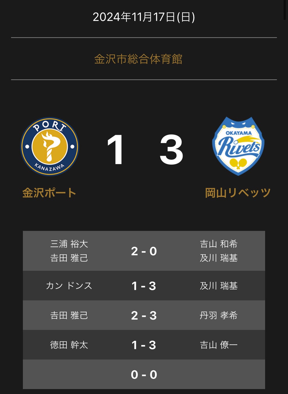 金沢ポート vs 岡山リベッツ の試合は、1-3で岡山リベッツが勝利しました。