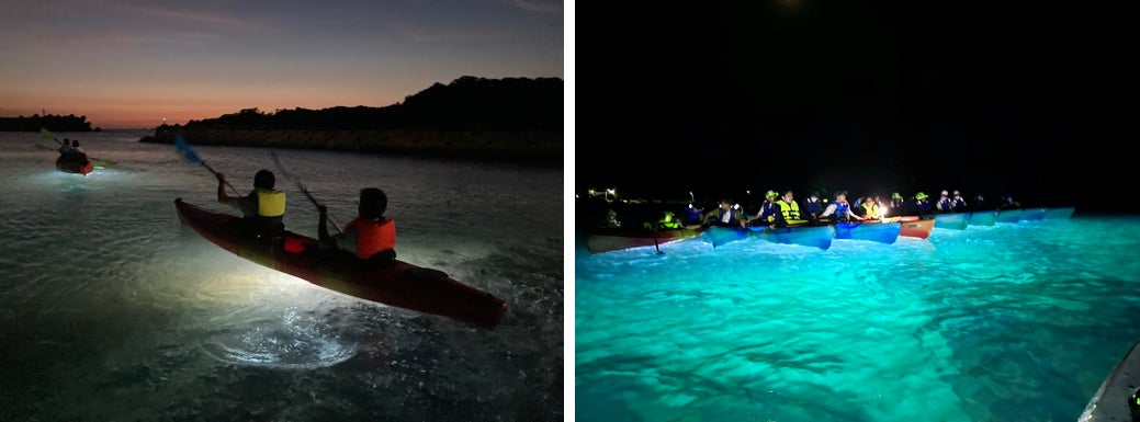 夕食後、調査隊は夜の海岸に向かいました。姫津ビーチのすぐ隣り達者(たっしゃ)海水浴場ではナイトカヤックが人気。運営するShow by JAWS(ショーバイジョーズ)の代表、岡部健太郎さんが昨年、始めたアクティビティです。陸上講習でオールの使い方を学び、舟底に灯りを点けた2人乗りカヤックで海に漕ぎだすと海中にぼんやりと明かりが広がってとても幻想的です。