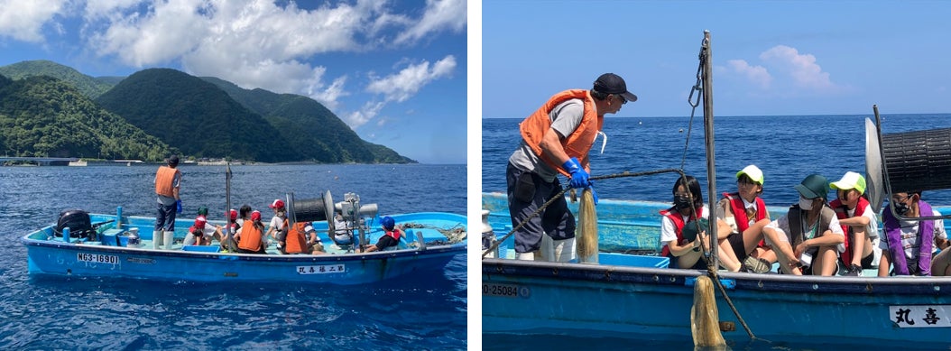 漁船に乗って沖合のワカメ養殖ポイントへ