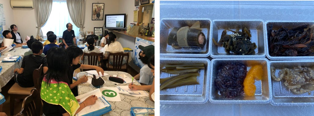 そして、お待ちかねの海藻試食会、参加者の前には「銀サケの昆布巻き」や「いごねりのゴマあえ」など6種類の試食メニューが並べられました。「ウミゾウメンのおひたし」という耳慣れない海藻料理もあります。一見、大人向けの料理に思われますが、参加者の口からは美味しいの声があがり、スタッフもうれしくなりました。