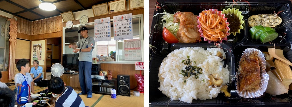 バスは、次の体験会場、黒姫漁港に停車。参加者は徒歩で昼食会場の黒姫公民館へ向かいます。昨日から人生で初めての海藻食も経験した参加者たちですが、まだまだランチの海藻メニューにも興味深々。中にはモズクの酢の物を味噌汁に投入して、新メニューに挑戦する強者も現れました。ナガモ入り卵焼き、昆布の煮物に加えて、ワカメとジャガイモの味噌汁もおいしくいただきました。