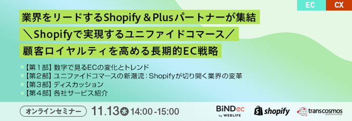【トランスコスモスオンラインセミナー】業界をリードするShopify & Plusパートナーが集結\Shopifyで実現するユニファイドコマース/を11/13(水)に開催