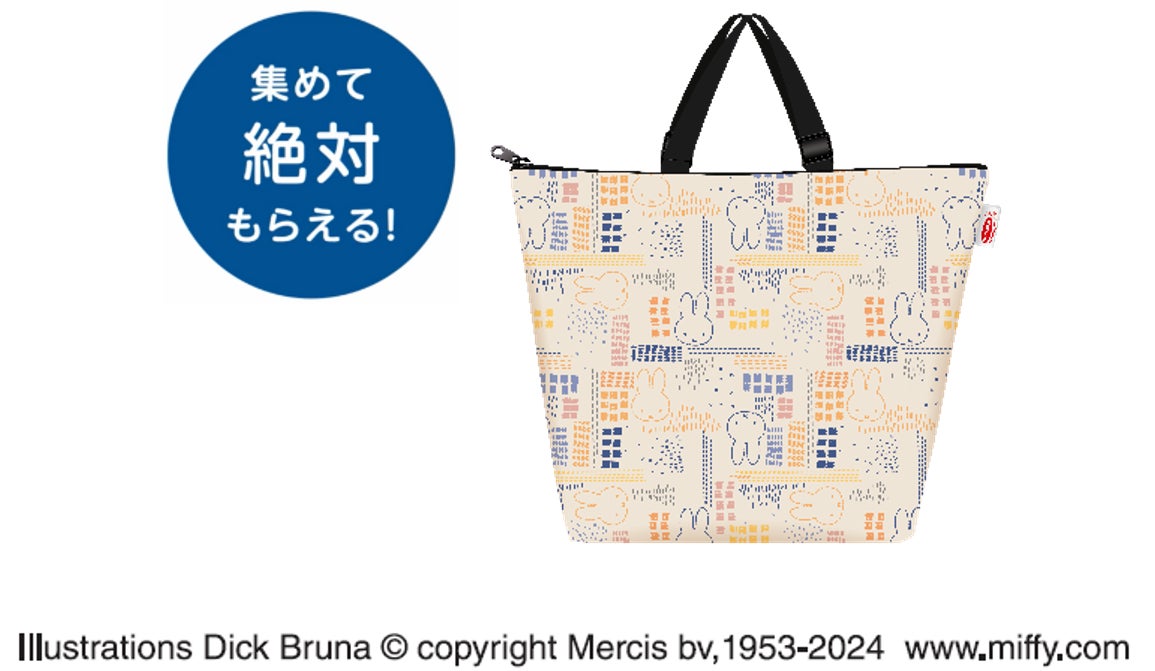 ① 対象商品に貼付されている応募マーク(㉔Chマーク)22枚を集めて送ると、ミッフィーがデザインされた、ミッフィーオリジナルバッグが絶対に貰えます。
