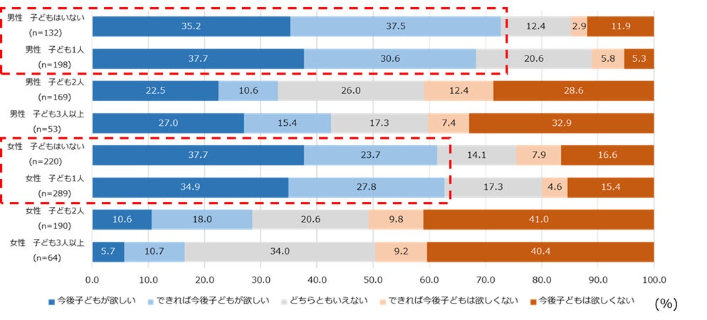 20歳~39歳の既婚男女に対し、今いる子どもの人数別に今後子どもが欲しいかを聞くと、男女とも子どもがいない層と子どもが1人の層では、6割以上で「今後子どもが欲しい」と回答した。