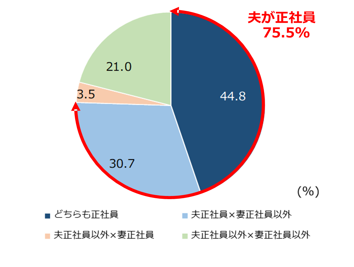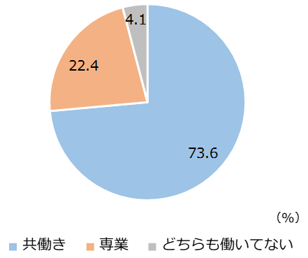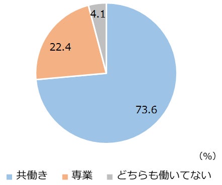 16歳~64歳の既婚者に対して自身と配偶者の働き方について聞くと、共働き世帯は73.6%となった。共働き世帯の内訳をみると、「夫婦ともに正社員」が44.8%、「夫が正社員・妻が正社員以外」が30.7%で、夫が正社員の割合を合計すると75.5%で全体の4分の3を占めた。