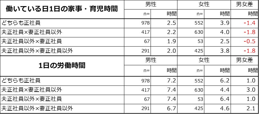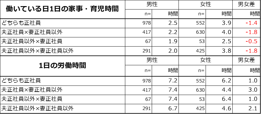 【図3】働いている日の家事・育児時間平均の男女比較と1日の労働時間平均の男女比較