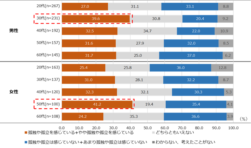 独身一人暮らしで私生活に最も孤独や孤立を感じる年代は男性が「30代(39.6%)」、女性が「50代(41.2%)」【図6、7】