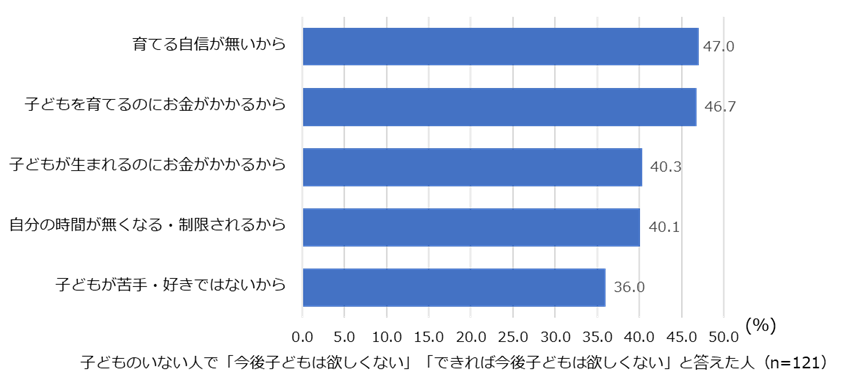 子どもが欲しくない理由は「育てる自信がないから(47.0%)」と「子どもを育てるのにお金がかかるから(46.7%)」がほぼ同値で、精神的な不安と経済的な不安が見られる【図4、5】