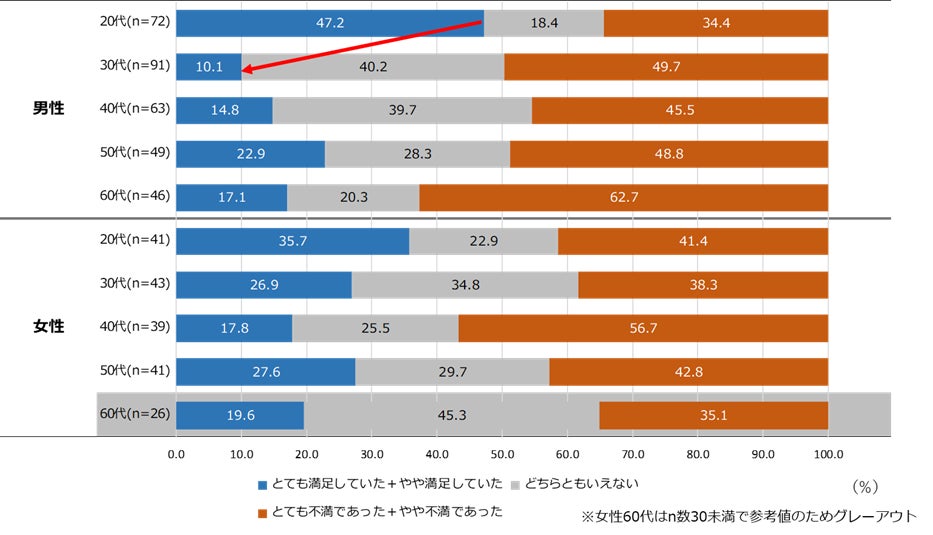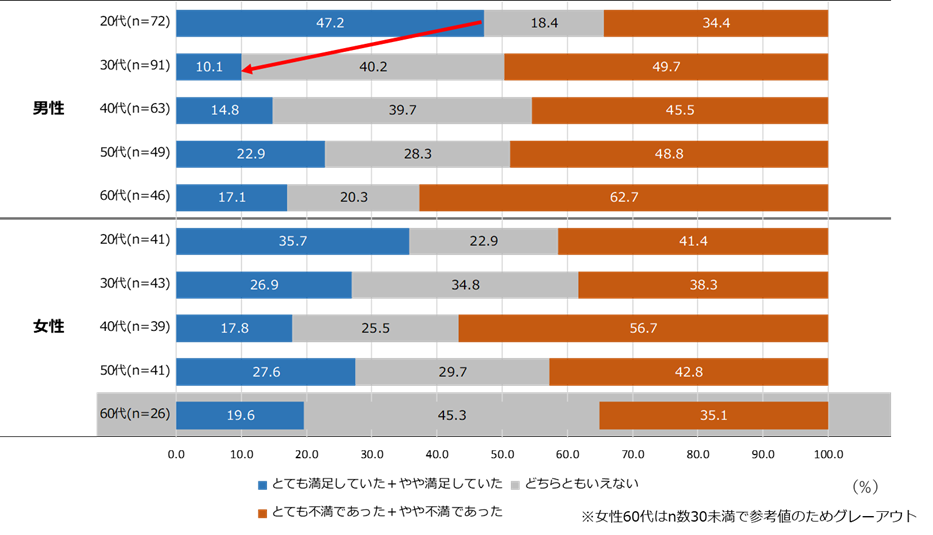 20~60代の独身で一人暮らしの男女に普段の私生活での孤独や孤立感を聞くと、「孤独や孤立を感じている」人が最も多かったのは、男性では30代39.6%で、女性では50代で41.2%だった(「孤独や孤立を感じている」+「やや孤独や孤立を感じている」の合計)。独身一人暮らしで私生活に孤独や孤立を感じている人の生活満足度を性別年代別で見ると、「孤独・孤立感を感じていても生活に満足している」人の割合は男性20代で47.2%だったが、30代では10.1%と大幅に減少した。【図6、7】