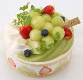 ミルク感豊かなクリーム、苺、メロンをしっとり焼き上げたスポンジケーキにサンド。メロンを贅沢に使った夏限定の直径14.5㎝のケーキ!