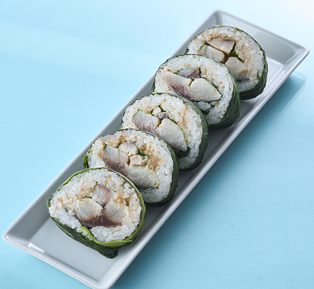 程よく脂の乗ったしめ鯖に梅肉、大葉を添えて海苔と高菜の二重巻きに。初夏にピッタリ、スッキリ、サッパリ。相性抜群の味わい。