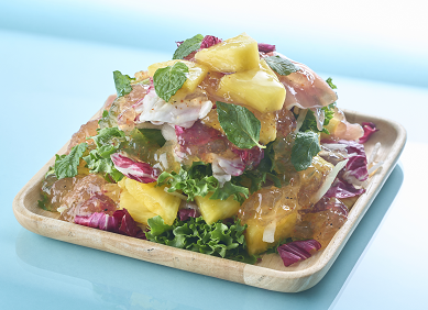 フレッシュパイナップルと生ハムに爽やかなレモンビネガーのジュレを加えた見た目にも涼し気なサラダです。