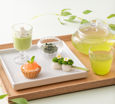 摘みたての新茶は豊かな旨味と上品で爽やかな香り。甘酸っぱいレアチーズタルトやクリーミーな抹茶とピスタチオのプリンなどを添えました。