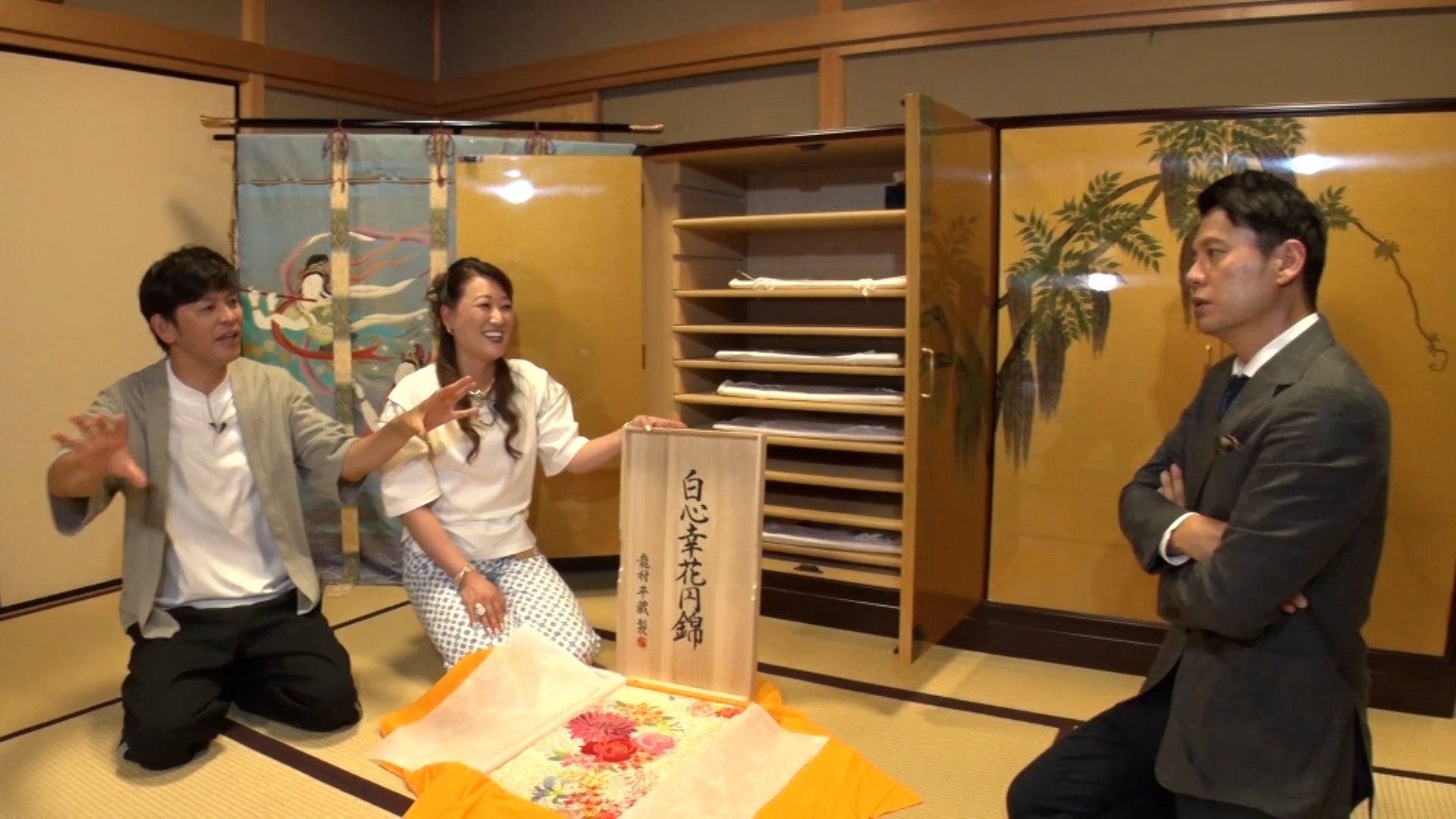 続いて訪れた「第二の間」でまず目を引いたのは、豪華絢爛な欄間。平成の名仏師・松本明慶が数子をイメージしたという観音菩薩像が彫られています。そして、金箔が施された桐たんすには、数子とかおりの誕生花が織り込まれた、親子の絆を示す袋帯も!
