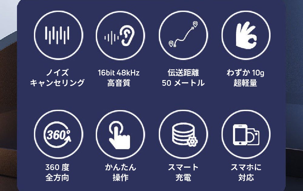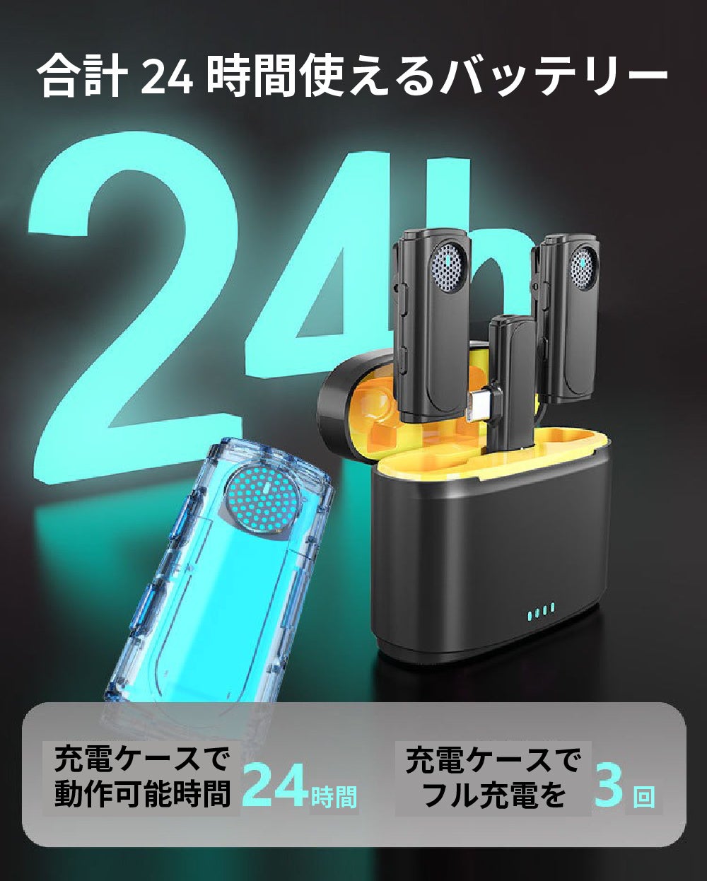 稼働時間 | ピンマイク、レシーバーはフル充電で約8時間使用が可能 充電ケースで約3回分の充電が可能、フル充電で合計24時間使用が可能 ピンマイク、レシーバー、ケースの充電に約1.5時間 |