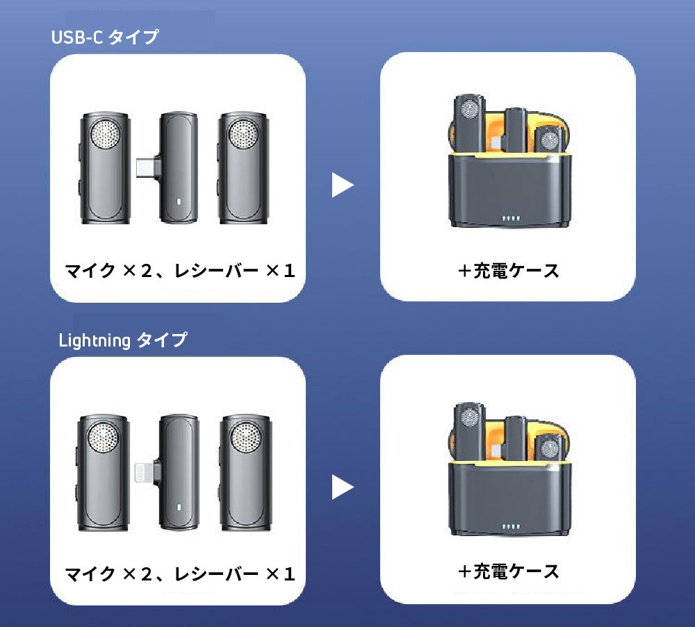 パッケージ内容 | ・ピンマイク ×2 ・レシーバー ×1 ・充電ケース ×1 ・USB充電ケーブル×1 ※USB充電アダプターは付属しませんのでご用意ください。 |