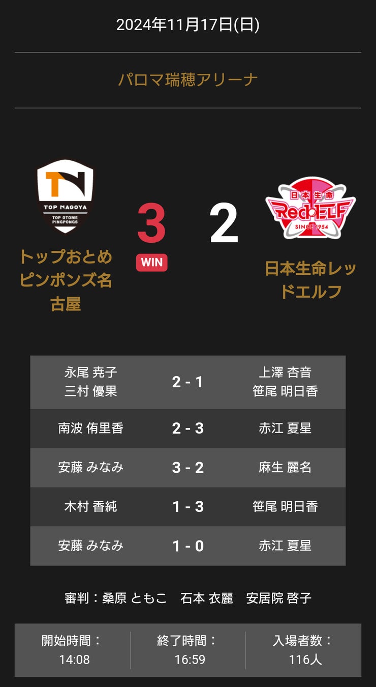 ノジマTリーグ 2024-2025 公式戦 11月17日開催 トップおとめピンポンズ名古屋 vs 日本生命レッドエルフ 試合結果