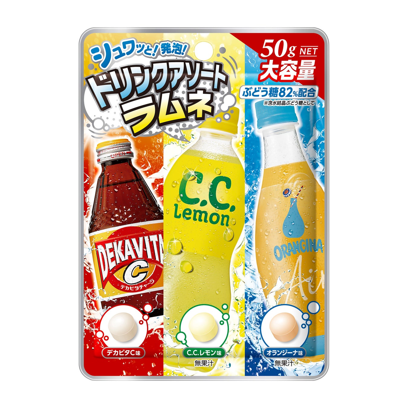 - 「デカビタC」「C.C.レモン」「オランジーナ」の3種類の味わいが楽しめるアソートタイプ。