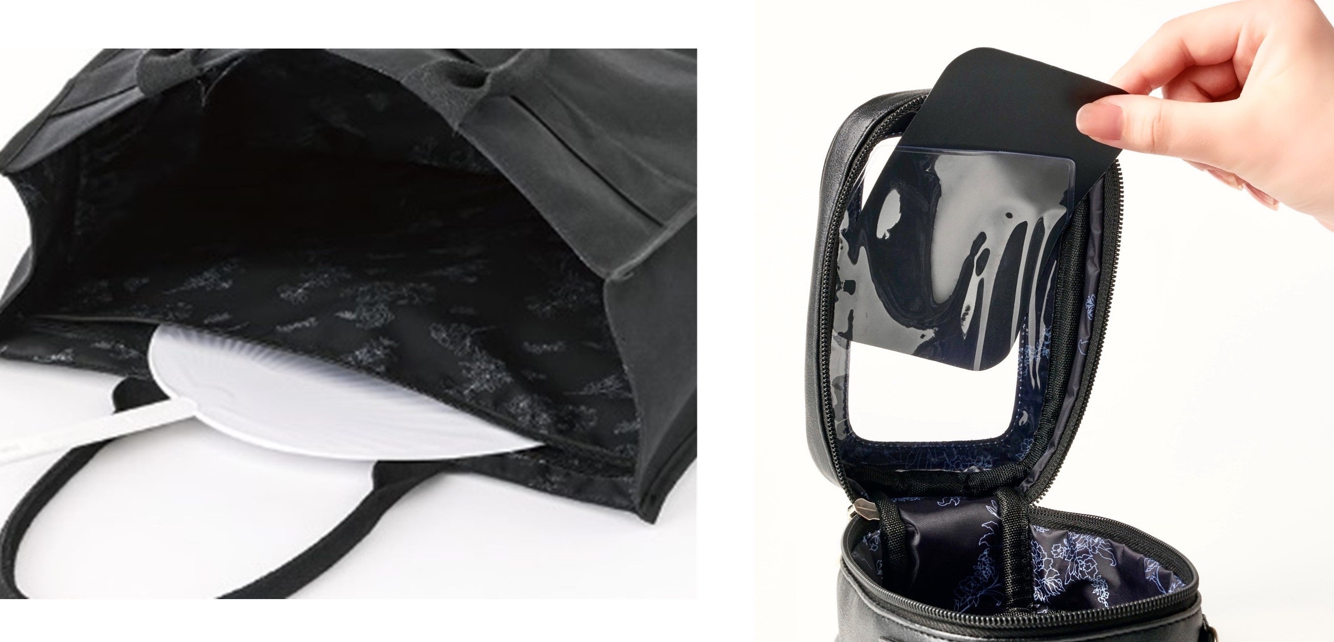 「トートバッグ」は、ジャンボサイズのうちわがはみ出ない大きなサイズで、マチが広く、ライブ会場や劇場の座席の下に置いても倒れにくい形です。ペンライトを入れやすい縦⾧のポケットや、双眼鏡やスマホ用の内ポケットを付けて、推し活アイテムの収納に特化した多機能バッグに仕上げました。