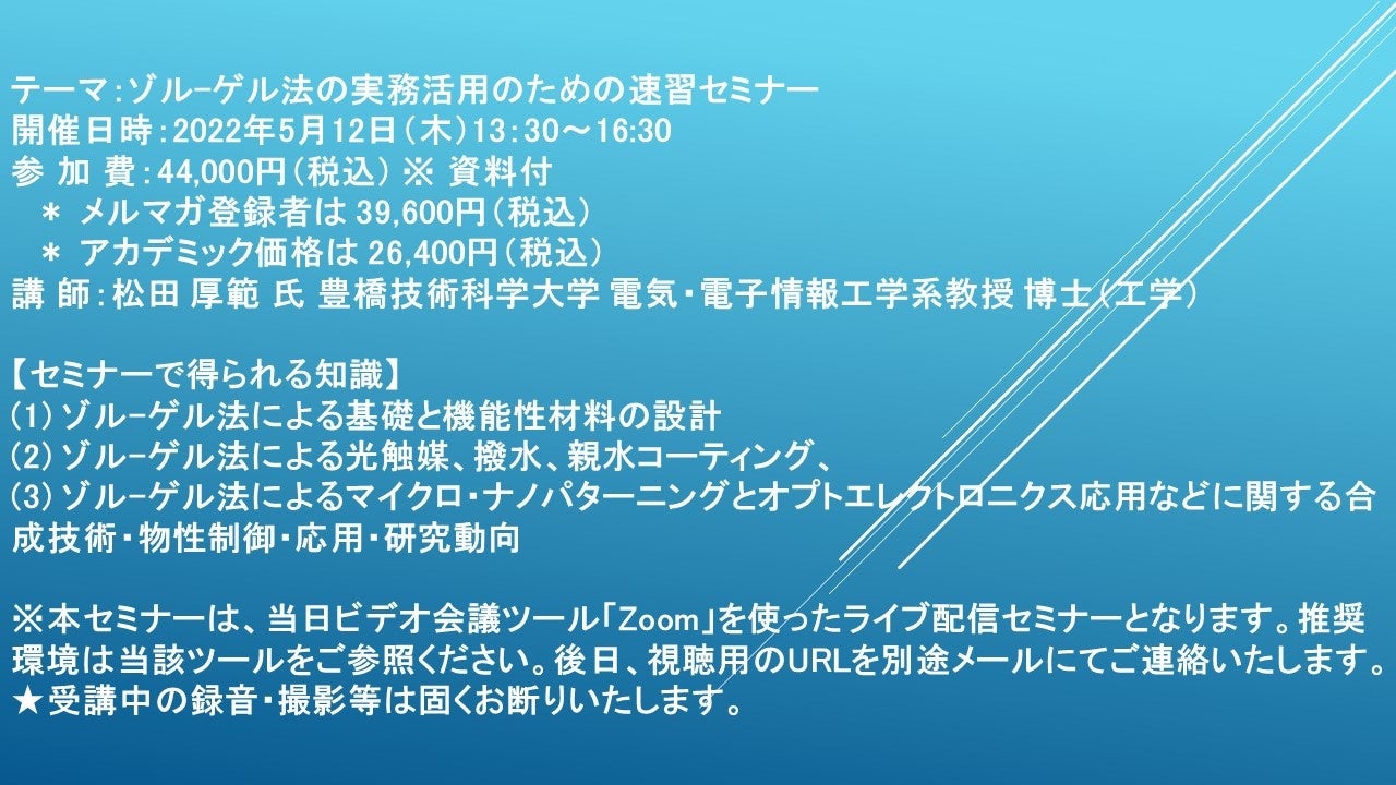 先端技術情報や市場情報を提供している(株)シーエムシー・リサーチ(千代田区神田錦町: https://cmcre.com/ )では、 各種材料・化学品などの市場動向・技術動向のセミナーや書籍発行を行っておりますが、 このたび「ゾル-ゲル法の実務活用のための速習セミナー」と題するセミナーを、 講師に松田 厚範 氏 豊橋技術科学大学 電気・電子情報工学系教授 博士(工学))をお迎えし、2022年5月12日(木)13:30より、 ZOOMを利用したライブ配信で開催いたします。 受講料は、 一般:44,000円(税込)、 弊社メルマガ会員:39,600円(税込)、 アカデミック価格は26,400円(税込)となっております(資料付)。
