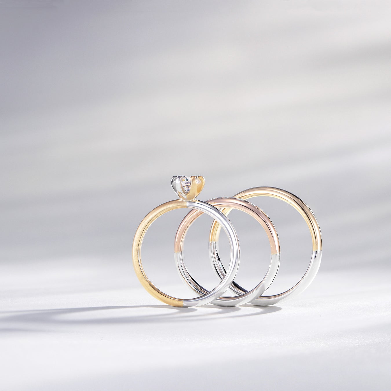 K18やプラチナなど、“異なる素材の組み合わせ”がコンセプトのリング。もともと別々の2人が一緒になるありまさまをイメージしており、“形式よりも、自分たちらしさを大切にしたい” そんな令和の結婚観にぴったりのブライダルリングです。