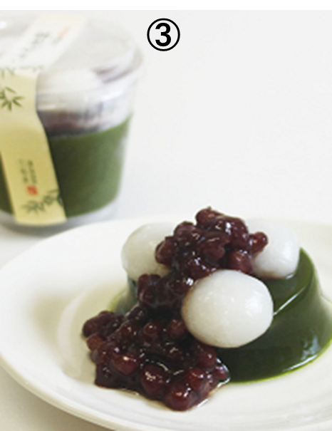 ③京都宇治茶をふんだんに使用した濃厚な抹茶ぜりぃです。あんは、北海道小豆を使用しています。