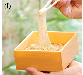 ①吟味に吟味を重ねた原材料を使い、独自の配合と製法によって特別に仕立てるわらび餅は、カットすることなく箱一面に流しこみ、箸でたぐると切れることなくねっとりと伸びるやわらかさが特徴です。