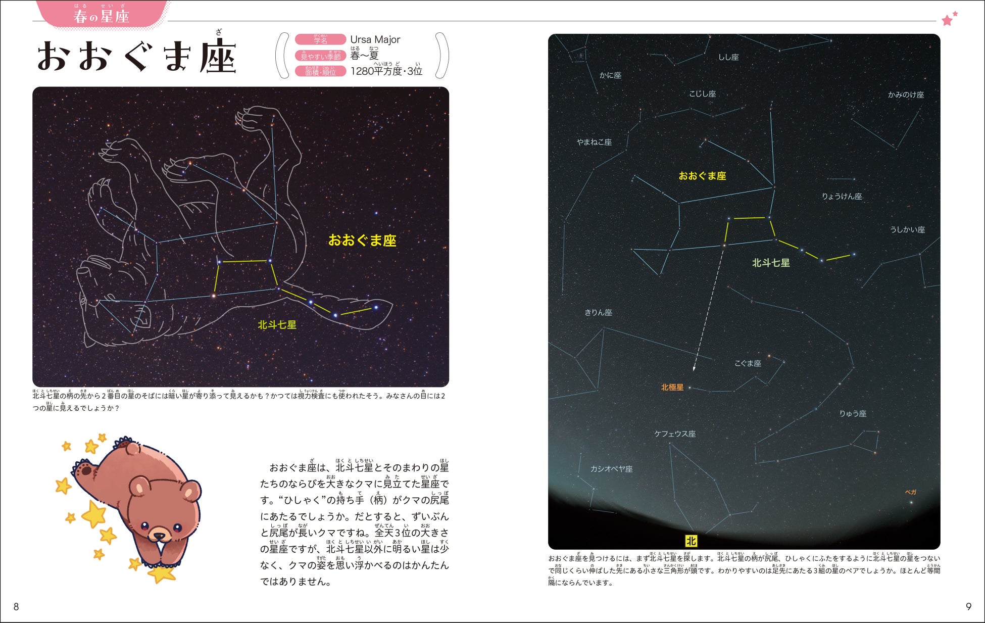 星座案内のページでは、美しい写真とイラストで四季の代表的な星座をやさしく紹介。