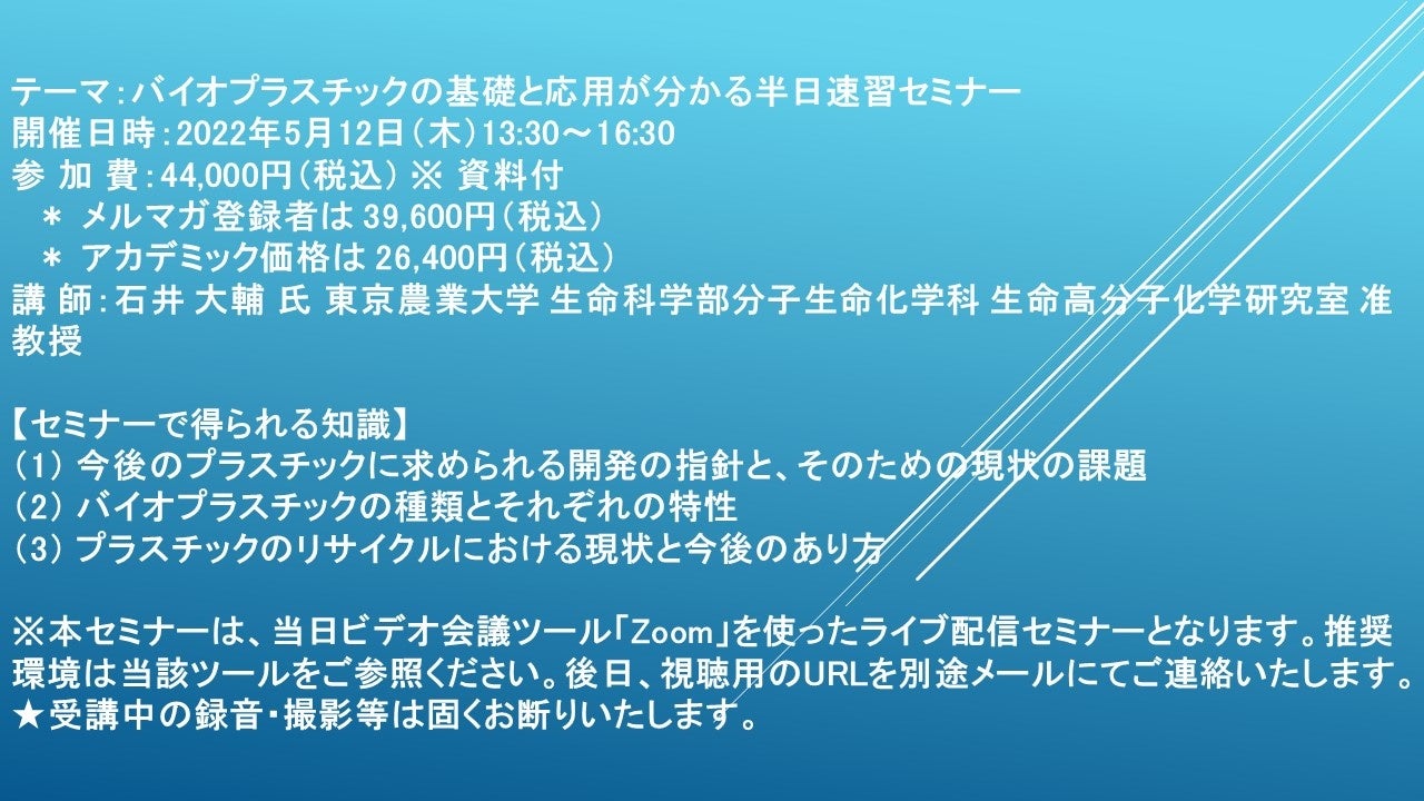 先端技術情報や市場情報を提供している(株)シーエムシー・リサーチ(千代田区神田錦町: https://cmcre.com/ )では、 各種材料・化学品などの市場動向・技術動向のセミナーや書籍発行を行っておりますが、 このたび「バイオプラスチックの基礎と応用が分かる半日速習セミナー」と題するセミナーを、 講師に石井 大輔 氏 東京農業大学 生命科学部分子生命化学科 生命高分子化学研究室 准教授)をお迎えし、2022年5月12日(木)13:30より、 ZOOMを利用したライブ配信で開催いたします。 受講料は、 一般:44,000円(税込)、 弊社メルマガ会員:39,600円(税込)、 アカデミック価格は26,400円(税込)となっております(資料付)。
