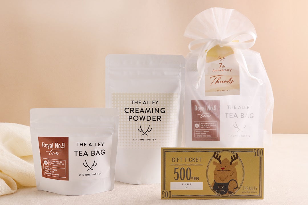 THE ALLEYの人気商品であるロイヤルNo.9紅茶のティーバッグ、クリーミーで豊かな味わいを楽しめるクリーミングパウダー、そしてTHE ALLEYの店舗でご利用いただけるドリンクチケット3000円分が入ったギフトセットです。