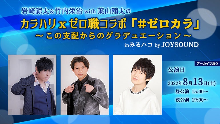カラオケルームで観て楽しめる多彩なコンテンツをお届けするJOYSOUNDの「みるハコ」では、USENが運営するニコ生番組『カラハリ』と『ゼロ職』のコラボ企画『岩崎諒太&竹内栄治 with 葉山翔太のカラハリⅹゼロ職コラボ「#ゼロカラ」~この支配からのグラデュエーション~inみるハコ by JOYSOUND』を配信することを決定しました。8月13日(土)の公演を、同日全国のカラオケ店舗でライブ・ビューイングするほか、後日アーカイブ配信を実施します。