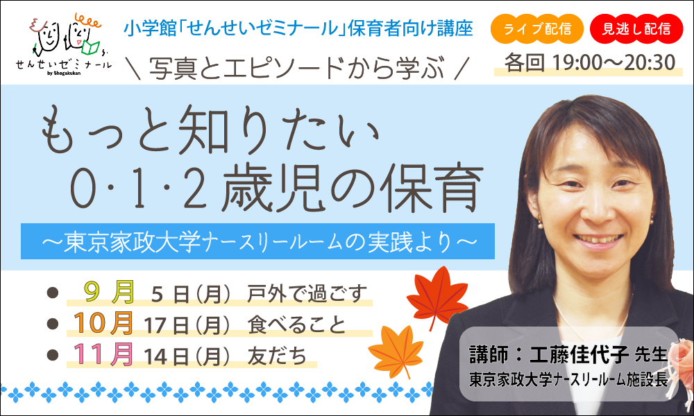 小学館【せんせいゼミナール】「もっと知りたい 0・1・2歳児の保育 〜東京家政大学ナースリールームの実践より〜」(9・10・11月)オンライン講座 申込受付中!